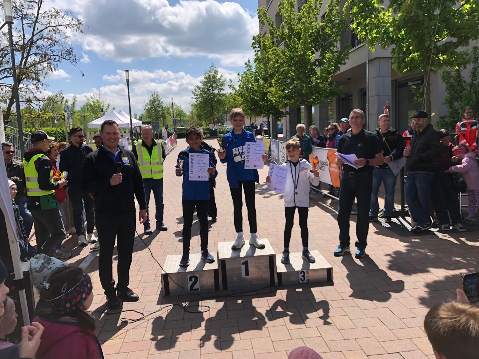 Bei den Jungs machte Matthias Rebmann das HÖP-Lauf-Triple perfekt, indem er zum dritten Mal in Folge die komplette Konkurrenz hinter sich ließ und sich in 3:19 Minuten zum Sieger krönte. Der gleichaltrige Jona Nelluvelil folgte ihm in 3:24 Minuten über die Ziellinie und belegte bei der Siegerehrung den zweiten Podestplatz. Der jüngere Bruder von Matthias, Julian Rebmann war Erster in seiner Altersklasse U12 und drittschnellster aller Jugendläufer. Somit war das Siegerpodest der männlichen Jugendlaufteilnehmer komplett mit DJK Athleten belegt:-))