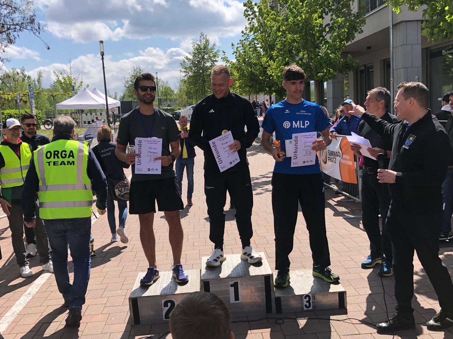 Die ersten drei weiblichen und männlichen Gesamtsieger der Läufe bekamen später von Bürgermeister Matthias Beck noch Urkunden und Pokale überreicht. Die DJK stellte erneut die größte Vereinsgruppe. Über 30 DJK Läufer/innen beteiligten sich beim Bambini-, Jugend- und Hauptlauf.